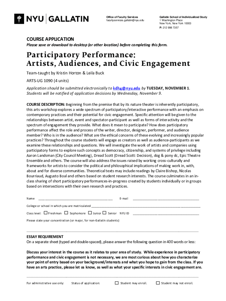 Office of Faculty Services. Gallatin NYU. Gallatin School of Individualized Study 1 Washington Place New York, New York 10003 P: 212 998 7357COURSE APPLICATIONPlease save or download to desktop (or