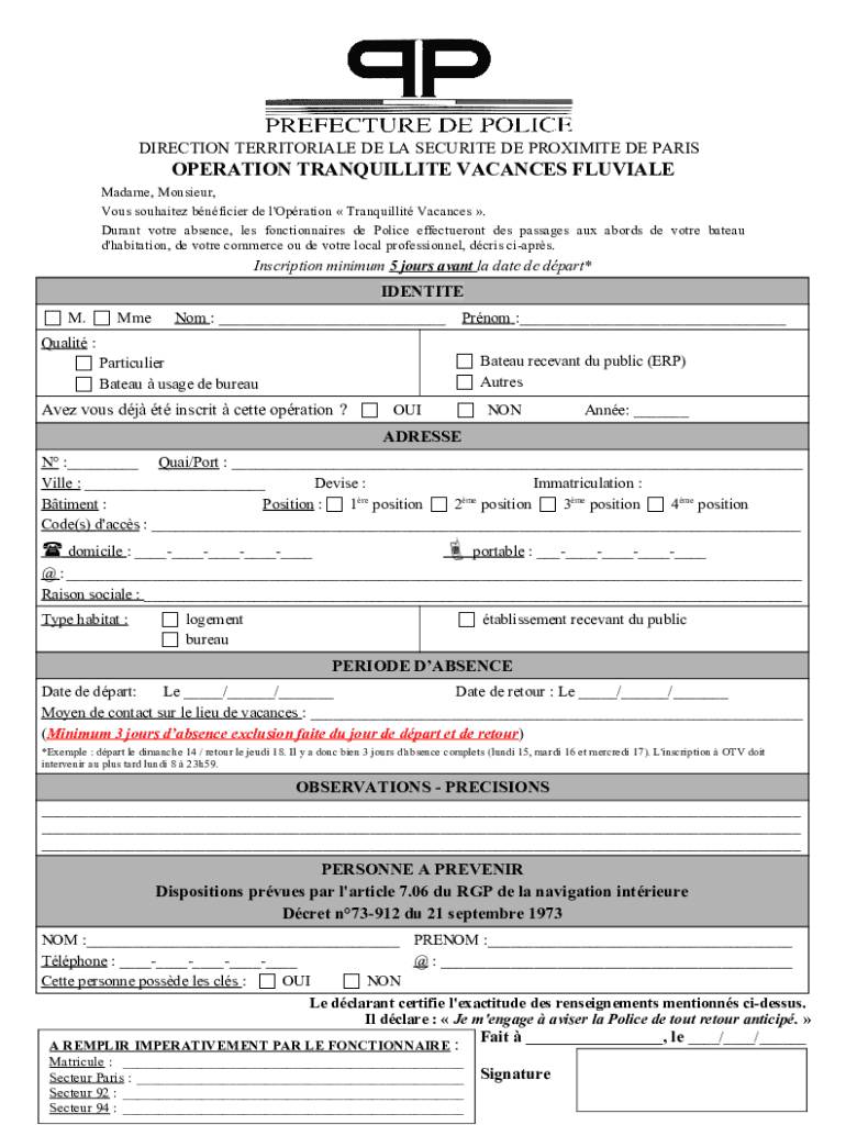 DIRECTION TERRITORIAL DE LA SECURITY DE PROXIMITY DE PARISOPERATION TRANQUILITY VACANCIES FLUVIAL Madame, Monsieur, Vows souhaitez officer de l 'Operation Tranquil lit Vacancies. Durant vote absence,