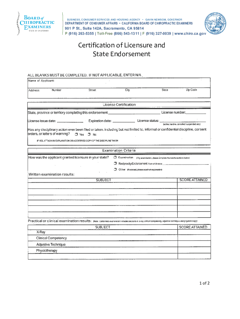 Get the free Board of Chiropractic Examiners - Certification of Licensure and State Endorsement. ...