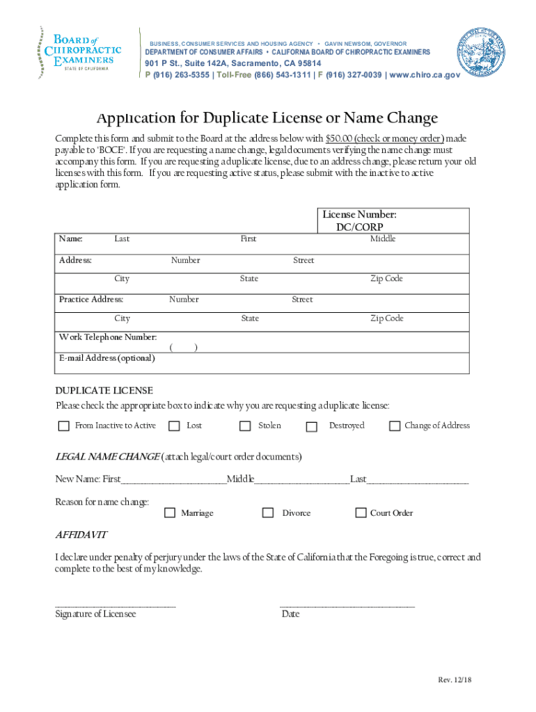 Get the free Board of Chiropractic Examiners - Application for Duplicate License or Name Change. ...
