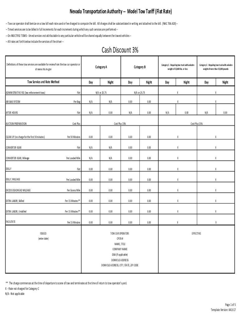 Nevada Transportation Authority Model Tow Tariff (Flat Rate) Tow car operator shall itemize on a tow bill each rate used or fee charged to compute the bill. All charges shall be substantiated in writing