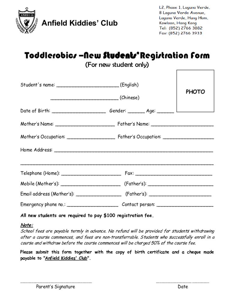 Anfield Kiddies Club5 Cumberland Road, Kowloon Tong, Kowloon, Hong Kong Tel: (852) 2794 3668 Fax: (852) 2549 3878 Email: admin Anfield.edu.HK www.anfield.edu.hkToddlerobics New StudentsRegistration