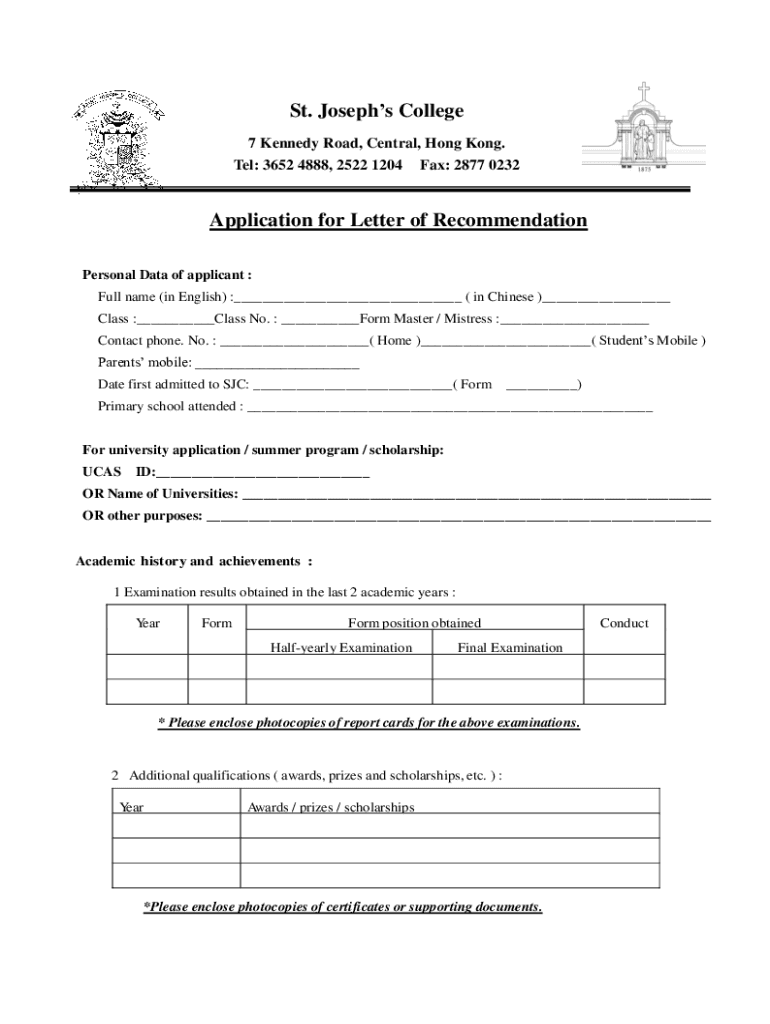 St. Josephs College 7 Kennedy Road, Central, Hong Kong. Tel: 3652 4888, 2522 1204 Fax: 2877 0232Application for Letter of Recommendation Personal Data of applicant : Full name (in English) : (in Chinese)