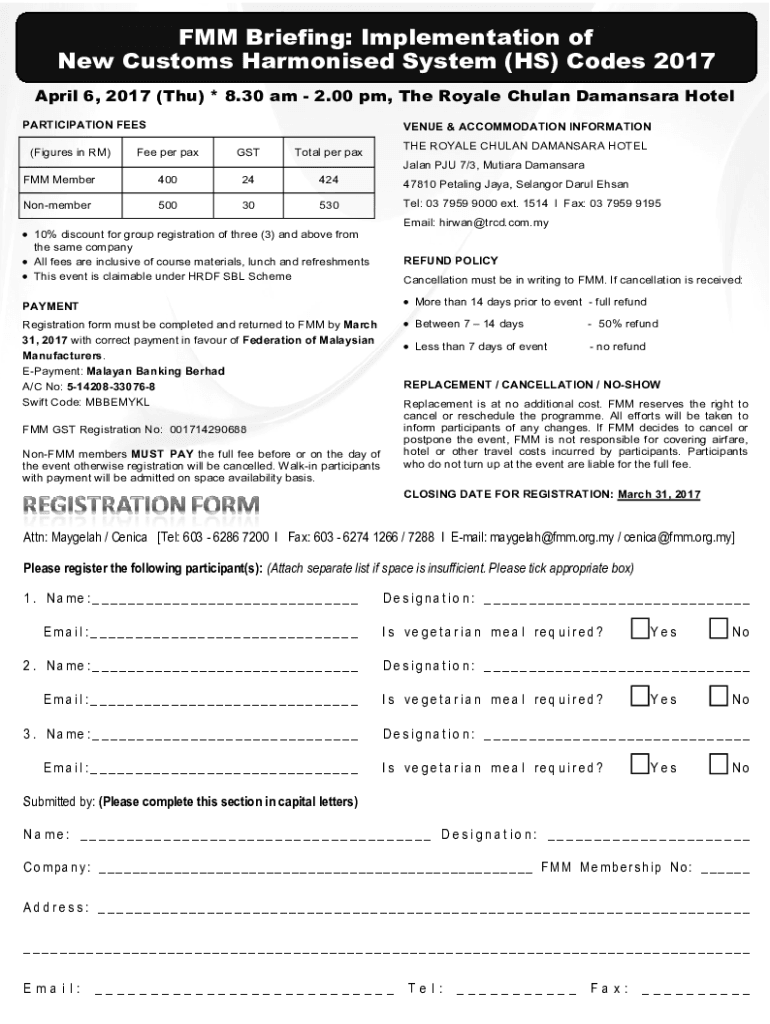 FMM Briefing: Implementation of New Customs Harmonized System (HS) Codes 2017 April 6, 2017 (Thu) * 8.30 am 2.00 pm, The Royale Chuan Mansard Hotel PARTICIPATION FEES (Figures in RM)VENUE & ACCOMMODATION