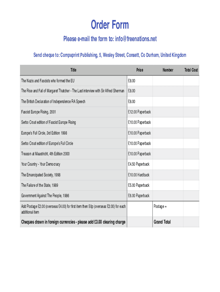 Order Form Please email the form to: info free nations.net!!! Send check to: Comparing Publishing, 5, Wesley Street, Consent, Co Durham, United Kingdom! TitlePriceThe Nazis and Fascists who formed