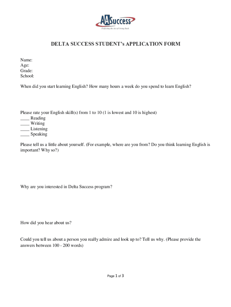 DELTA SUCCESS Students APPLICATION FORM Name: Age: Grade: School: When did you start learning English? How many hours a week do you spend to learn English? Please rate your English skill(s) from 1