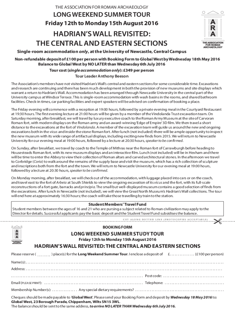 Get the free Hadrian's Wall 2016 Long Weekend Tour form. Hadrian's Wall 2016 Long Weekend Tour form
