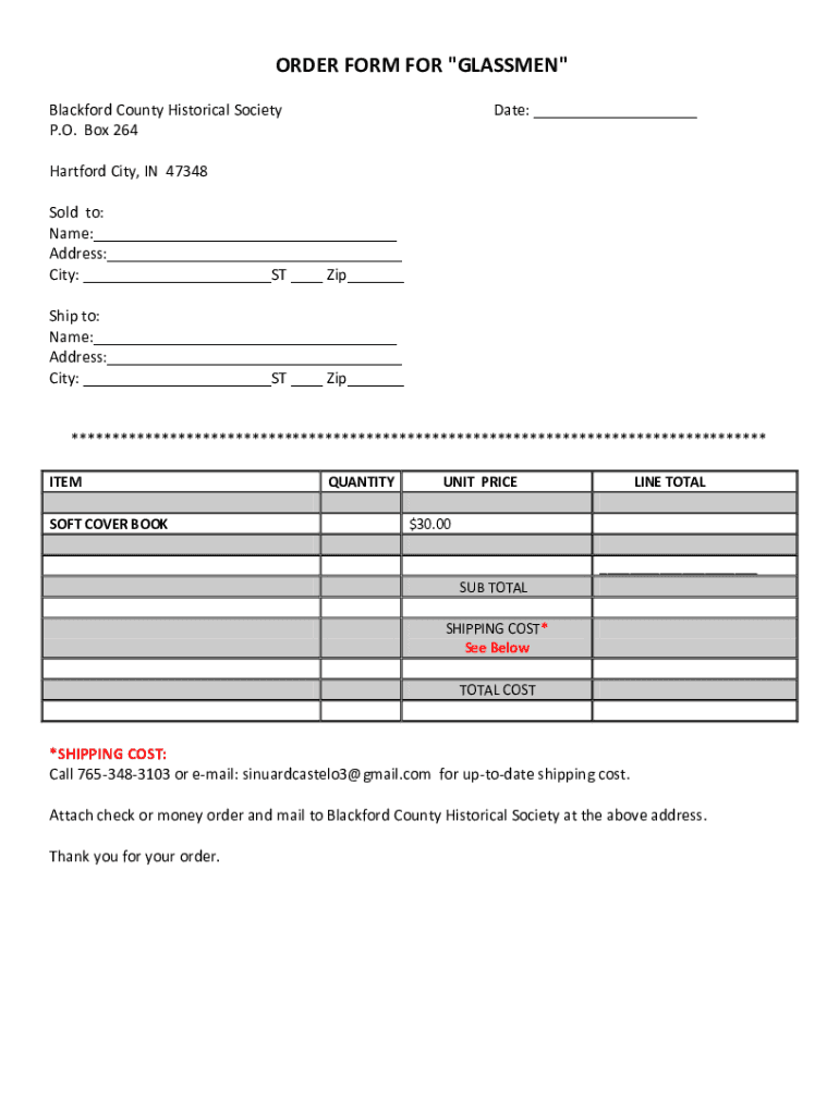 ORDER FORM FOR “GLASSMEN Black ford County Historical Society P.O. Box 264Date: Hartford City, IN 47348 Sold to: Name: Address: City: ST Zip Ship to: Name: Address: City: ST Zip *************************************************************************************