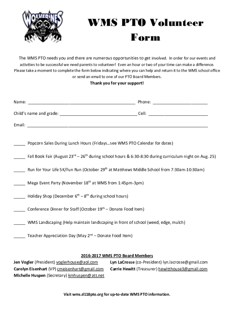 WMS PTO Volunteer Form The WMS PTO needs you and there are numerous opportunities to get involved. In order for our events and activities to be successful we need parents to volunteer! Even an hour