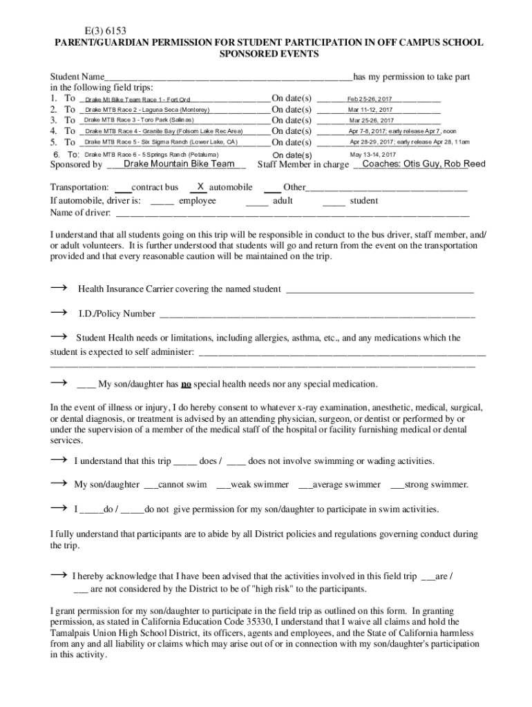 E(3) 6153 PARENT/GUARDIAN PERMISSION FOR STUDENT PARTICIPATION IN OFF CAMPUS SCHOOL SPONSORED EVENTS Student Name has my permission to take part in the following field trips: Feb 2526, 2017 1. To
