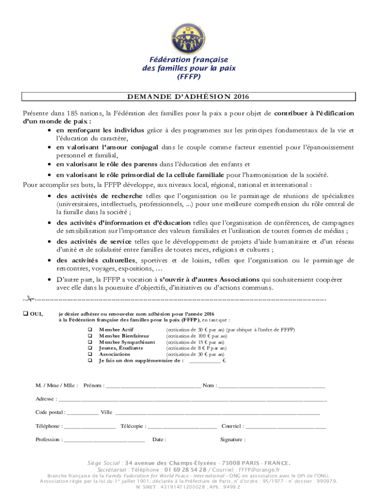 Formation franchise DES families pour la paid (FFAP) DEMAND ADHESION 2016 Present days 185 nations, la Formation DES families pour la paid a pour object DE contributed edification dun mode DE paid