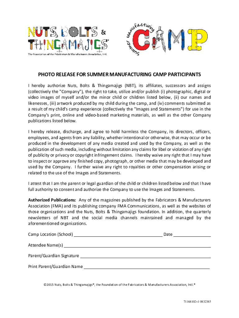 PHOTO RELEASE FOR SUMMER MANUFACTURING CAMP PARTICIPANTS I hereby authorize Nuts, Bolts & Thingamajigs (NBT), its affiliates, successors and assigns (collectively the “Company “), the right to