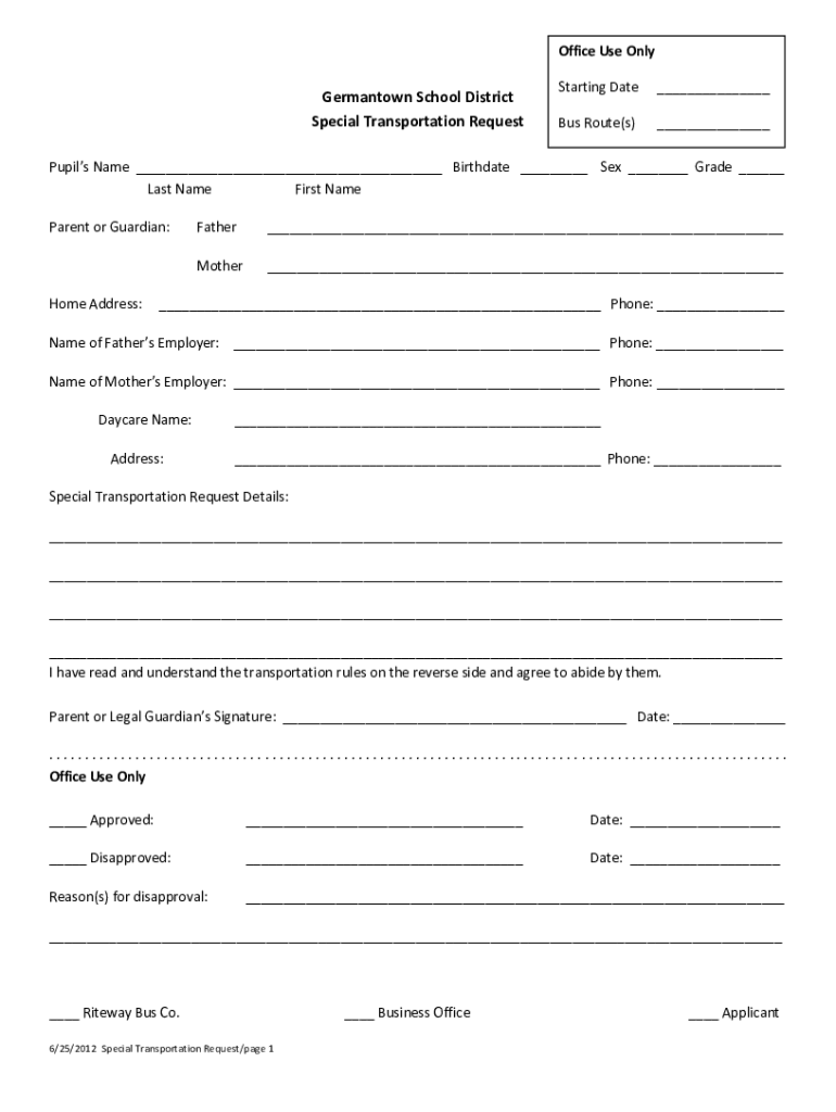 Office Use OnlyGermantown School District Special Transportation Request Starting Date Bus Route(s) Pupils Name Birthdate Sex Grade Last Name First Name Parent or Guardian:Home Address:Father Mother