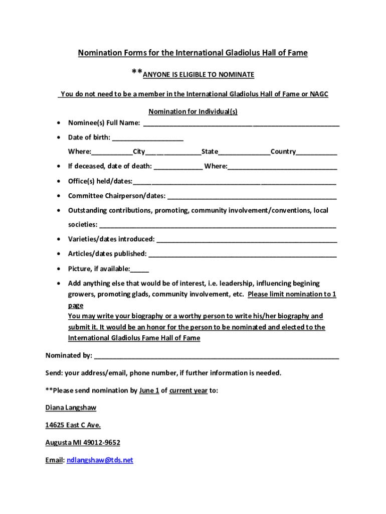 Nomination Forms for the International Gladiolus Hall of Fame**ANYONE IS ELIGIBLE TO NOMINATE You do not need to be a member in the International Gladiolus Hall of Fame or NGC Nomination for Individual(s)