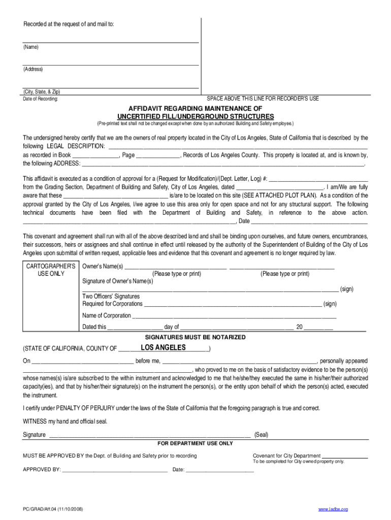 Get the free Affidavit Regarding Maintenance of Uncertified Fill ... - LADBS