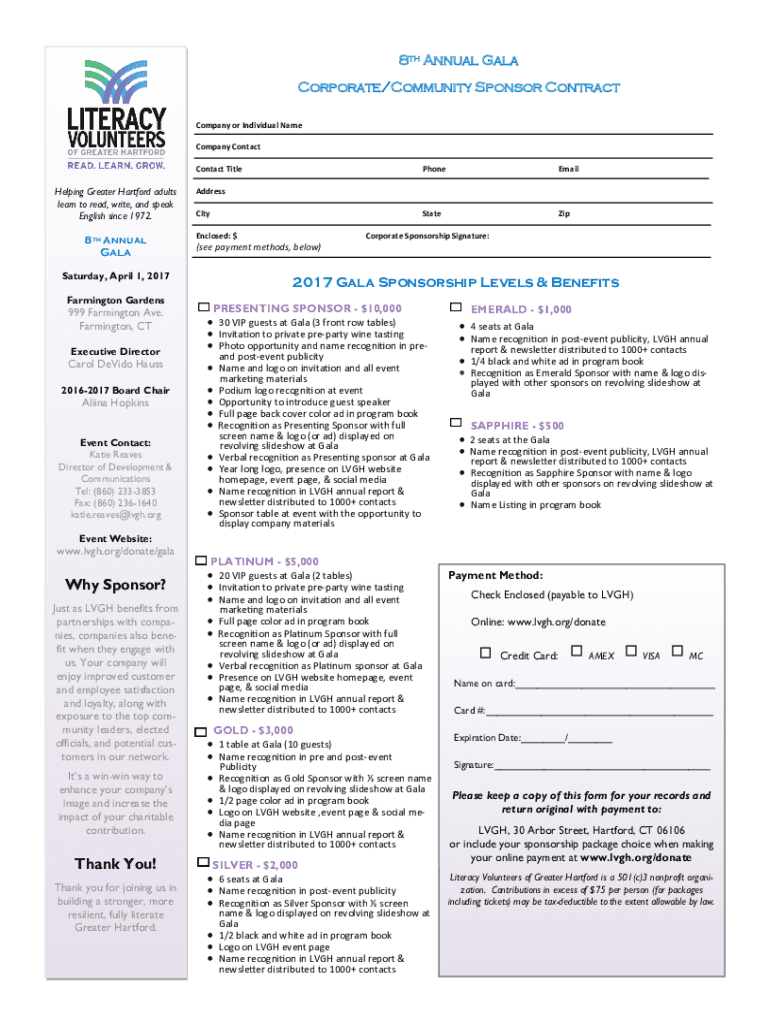 8th Annual Gala Corporate/Community Sponsor Contract Company or Individual Name Company Contact TitleHelping Greater Hartford adults learn to read, write, and speak English since 1972. 8th AnnualGala999