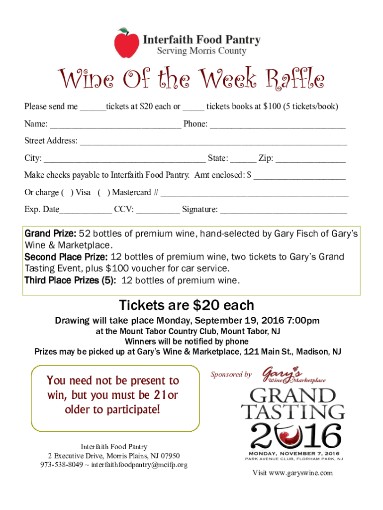 Wine Of the Week Raffle Please send me tickets at $20 each or tickets books at $100 (5 tickets/book) Name: Phone: Street Address: City: State: Zip: Make checks payable to Interfaith Food Pantry. Amt