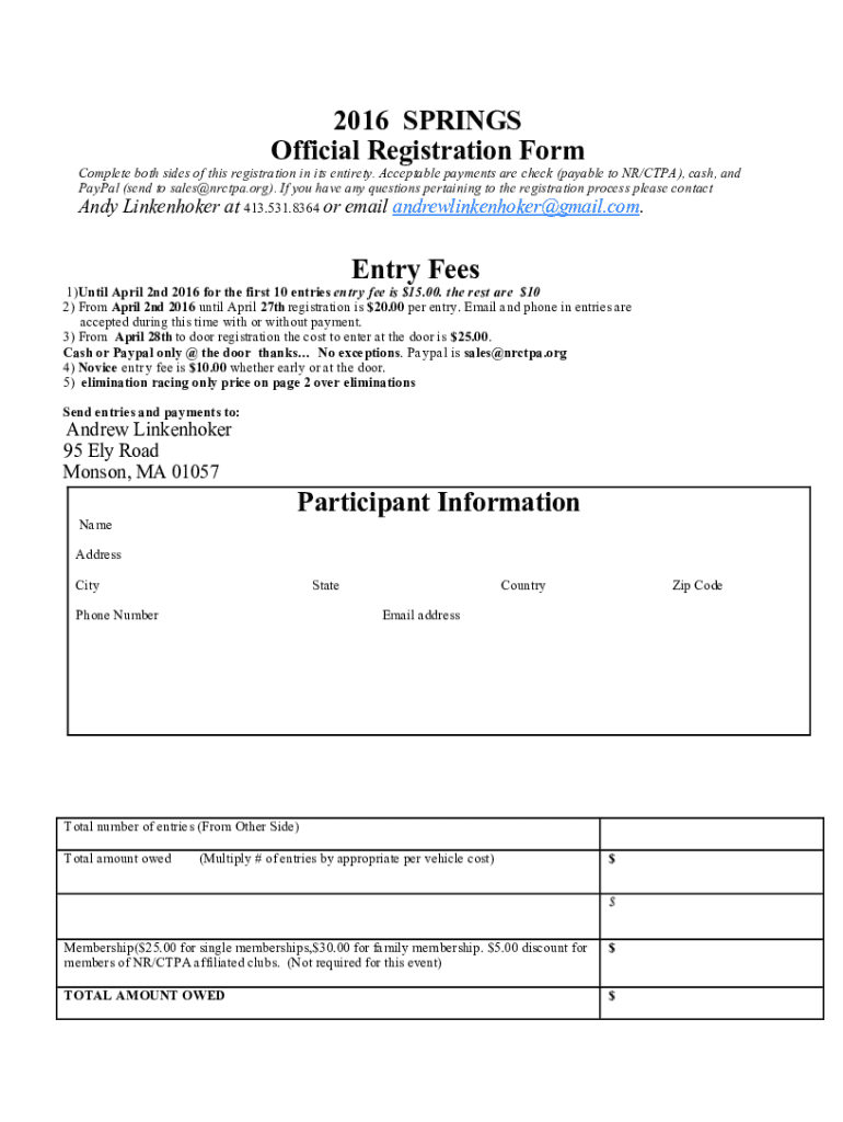 Official Registration FormComplete both sides of this registration in its entirety. Acceptable payments are check (payable to NR/CPA), cash, and