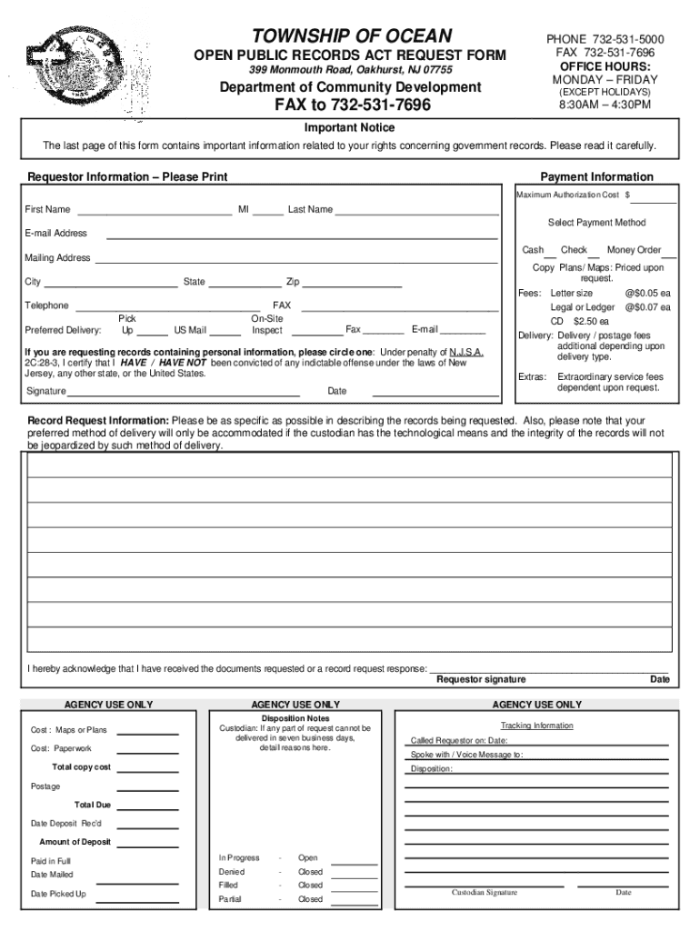 TOWNSHIP OF CELLPHONE 7325315000 FAX 7325317696 OFFICE HOURS: MONDAY FRIDAYOPEN PUBLIC RECORDS ACT REQUEST FORM 399 Monmouth Road, Pankhurst, NJ 07755Department of Community Development(EXCEPT HOLIDAYS)FAX