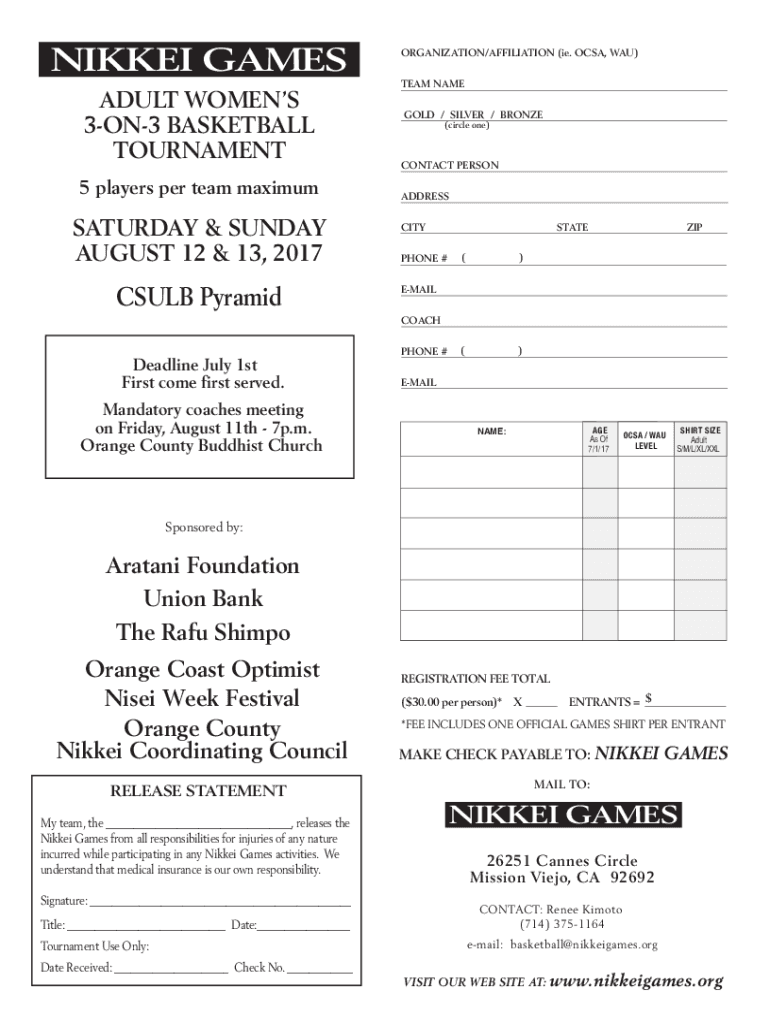 NIKKEI GAMES ADULT WOMEN 3ON3 BASKETBALL TOURNAMENT 5 players per team maximumSATURDAY & SUNDAY, AUGUST 12 & 13, 2017CSULB PyramidORGANIZATION/AFFILIATION (i.e. CSA, WAS) TEAM NAME GOLD / SILVER /