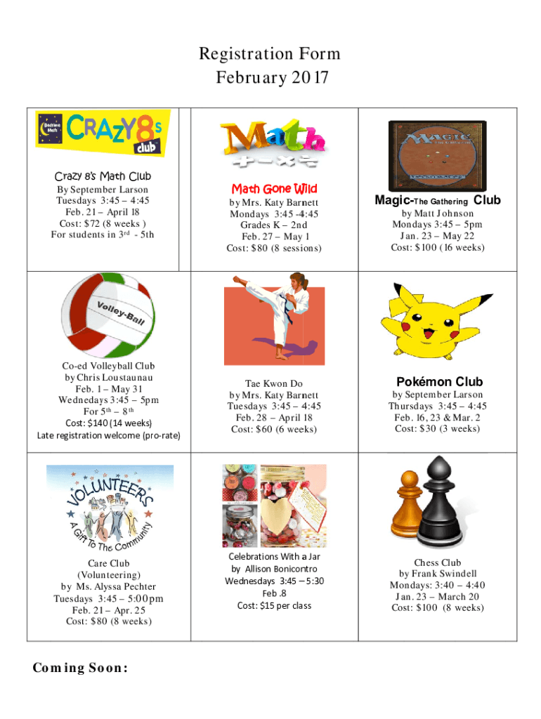 Register R ration F Form Fear Mary 20 017 Crazy 8s Math M Club By Septum Amber Larson Tuesdays 3:45 4:45 Feb. 21 April 18 Cost: $72 (8 weeks) For students in 3rd 5th match Gone W Wildman the Gathering