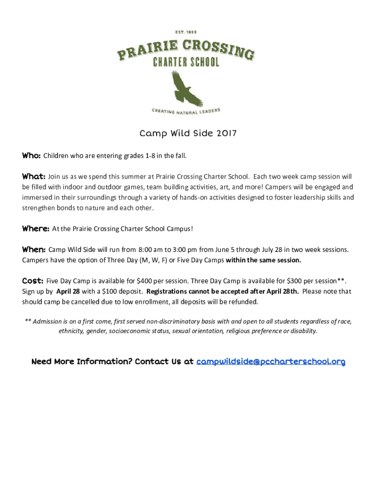 What: Join us as we spend this summer at Prairie Crossing Charter School. Each two week camp session will
