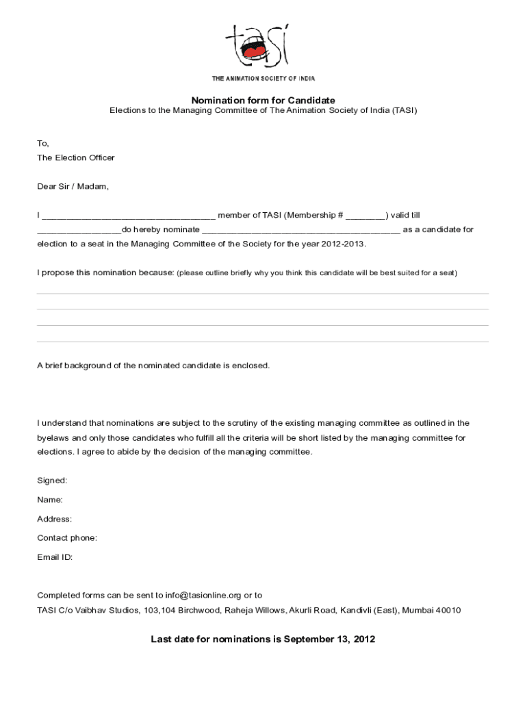 Nomination form for Candidate Elections to the Managing Committee of The Animation Society of India (TASK)To, The Election Officer Dear Sir / Madam, I member of TASK (Membership #) valid till do hereby