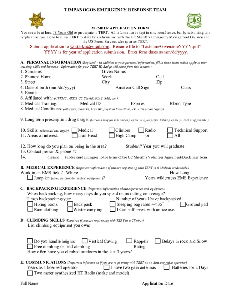 TIMPANISTS EMERGENCY RESPONSE REMEMBER APPLICATION FORM