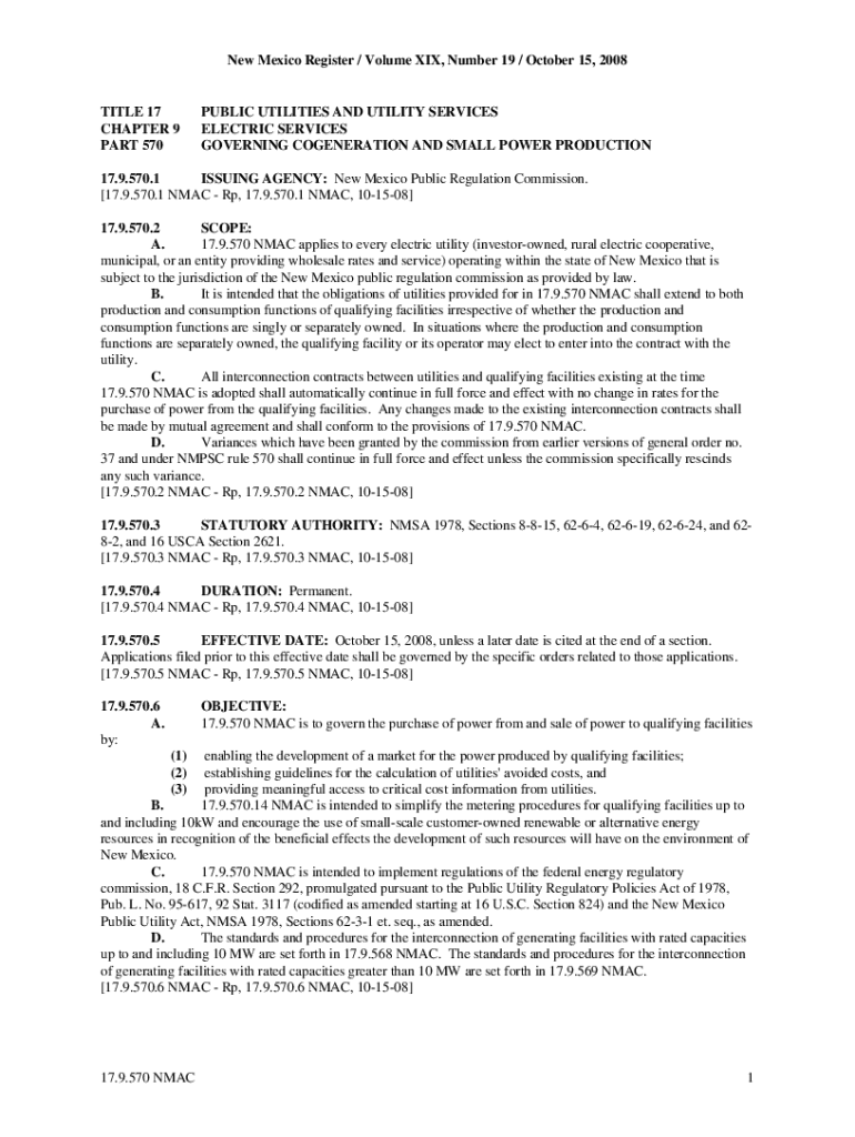 New Mexico Register / Volume XIX, Number 19 / October 15, 2008TITLE 17 CHAPTER 9 PART 570PUBLIC UTILITIES AND UTILITY SERVICES ELECTRIC SERVICES GOVERNING GENERATION AND SMALL POWER PRODUCTION17.9.570.1
