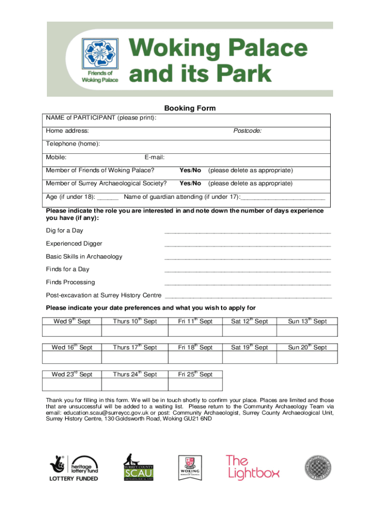 Booking Form NAME of PARTICIPANT (please print): Home address:Postcode:Telephone (home): Mobile:Email:Member of Friends of Working Palace? Yes/No(please delete as appropriate)Member of Surrey Archaeological