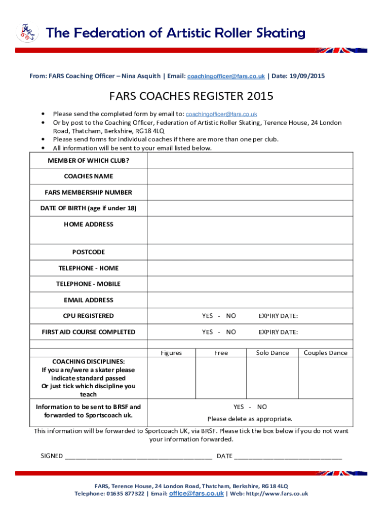 From: CARS Coaching Officer Nina Asquith Email: coaching officer cars.co.UK Date: 19/09/2015FARS COACHES REGISTER 2015 Please send the completed form by email to: coaching officer cars.co.UK Or by