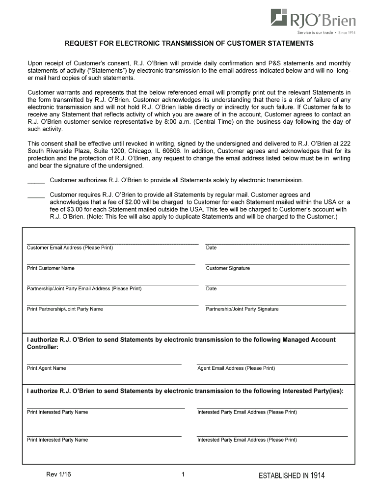 Any customer of R.J. O'Brien, as well as authorized agents, partnerships, and interested parties, can utilize this form to opt for electronic statements.