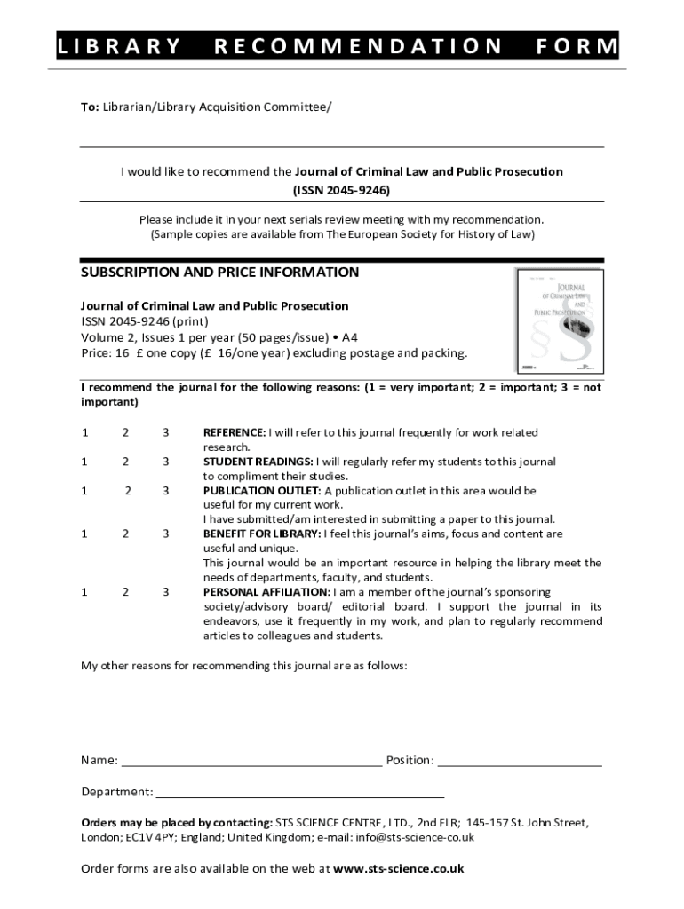LIBRARYRECOMMENDATIONFORMTo: Librarian/Library Acquisition Committee/I would like to recommend the Journal of Criminal Law and Public Prosecution (ISSN 20459246) Please include it in your next serials