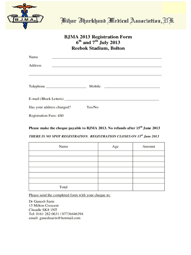 JMA 2013 Registration Form 6th and 7th July 2013 Reebok Stadium, Bolton Name Address Telephone Mobile Email (Block Letters) Has your address changed? Yes/Registration Fees: 60 Please make the check