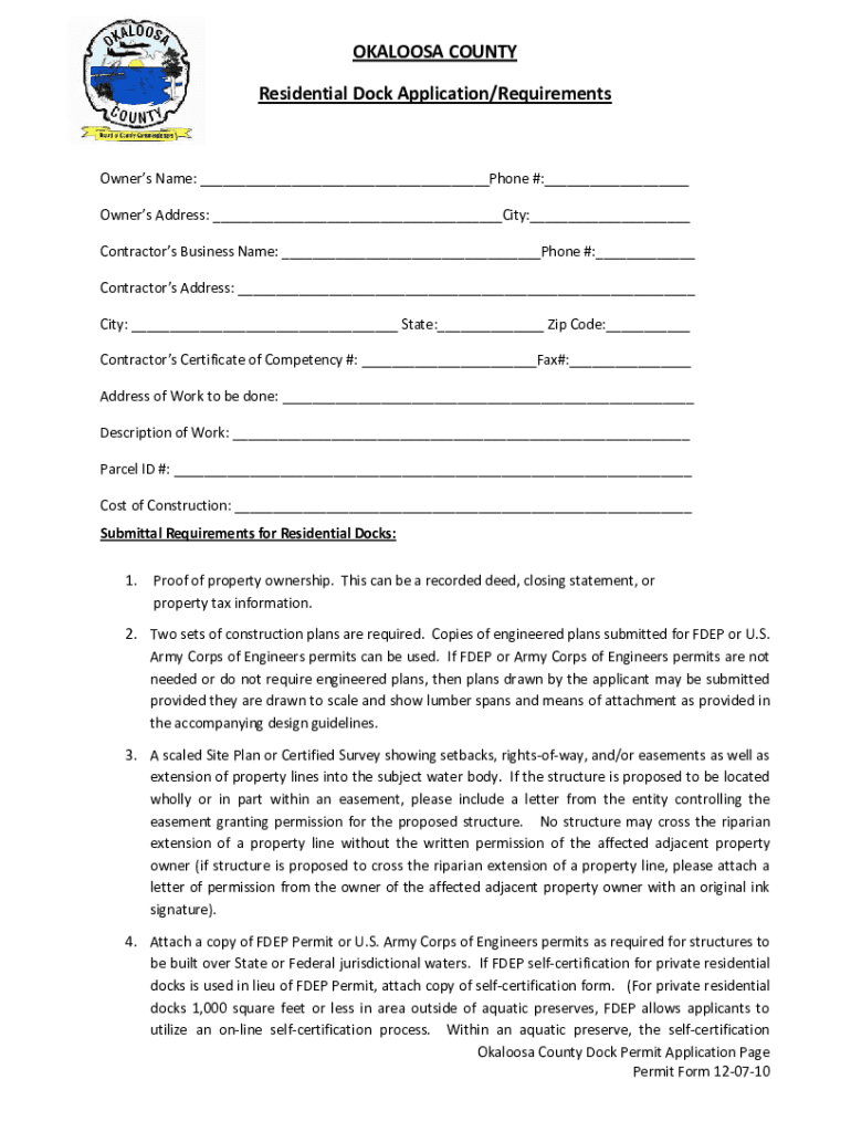 Get the free OKALOOSA COUNTY Residential Dock Application/Requirements - co okaloosa fl