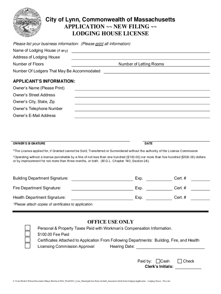 City of Lynn, Commonwealth of Massachusetts APPLICATION NEW FILING LODGING HOUSE LICENSE Please list your business information: (Please print all information) Name of Lodging House (if any) Address