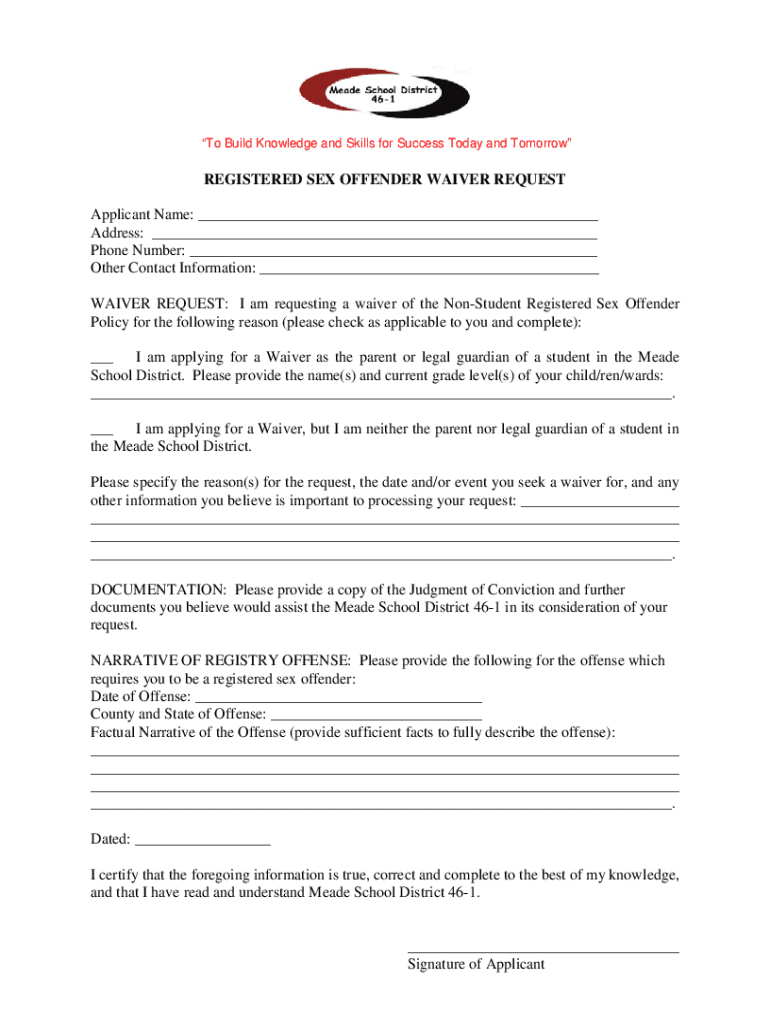 To Build Knowledge and Skills for Success Today and TomorrowREGISTERED SEX OFFENDER WAIVER REQUEST Applicant Name: Address: Phone Number: Other Contact Information: WAIVER REQUEST: I am requesting