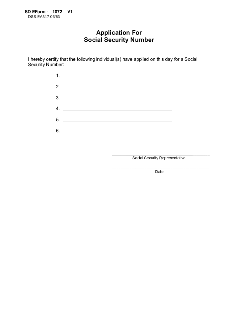 Complete and use the button at the end to print for mailing. SDE Form 1072V1HELPDSSEA34706/83Application For Social Security Number I hereby certify that the following individual(s) have applied on