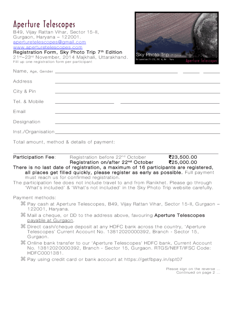 Aperture Telescopes B49, Vijay Rattan Vicar, Sector 15II, Gurgaon, Haryana 122001. Aperture telescopes gmail.com www.aperturetelescopes.com Registration Form, Sky Photo Trip 7th Edition 21 s t 23