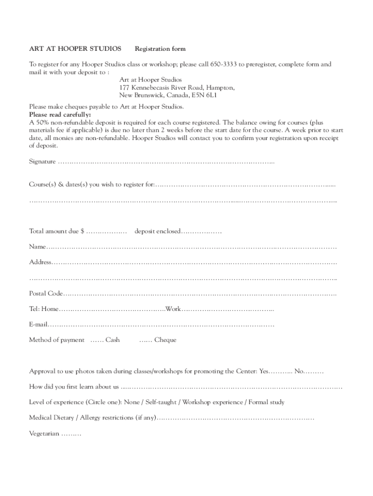 ART AT HOOPER STUDIOSRegistration form register for any Hooper Studios class or workshop; please call 6503333 to preregister, complete form and