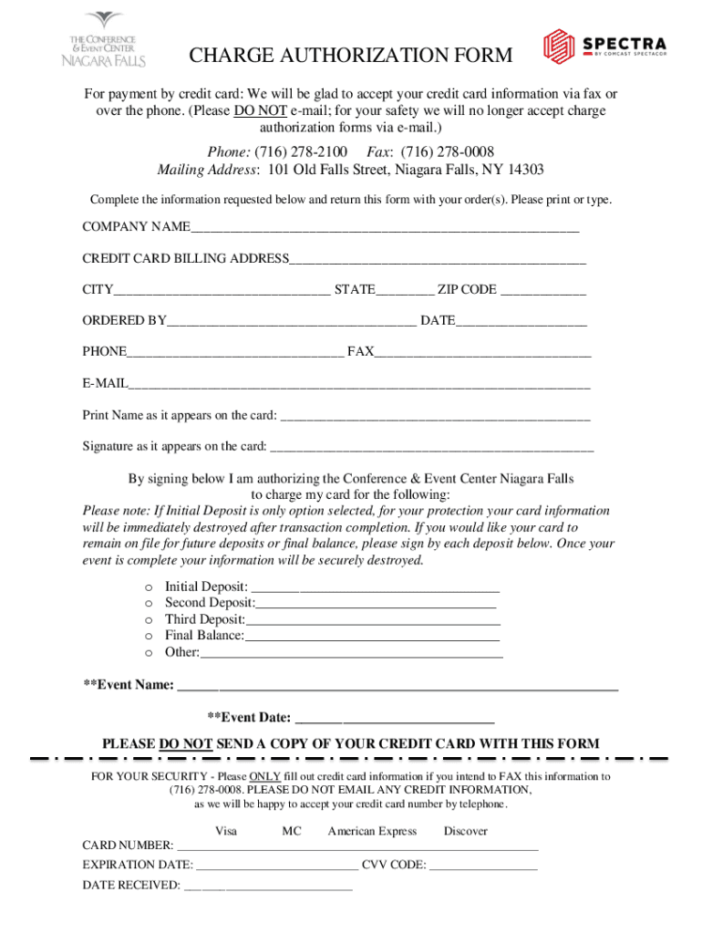 CHARGE AUTHORIZATION FORM For payment by credit card: We will be glad to accept your credit card information via fax or over the phone. (Please DO NOT email; for your safety we will no longer accept