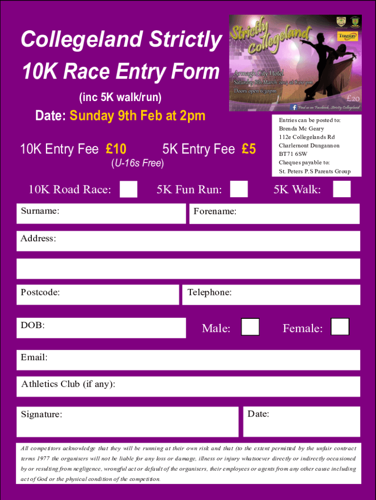 10K Entry Fee 105K Entry Fee 5(U16s Free)10K Road Race:5K Fun Run:Surname:Entries can be posted to: