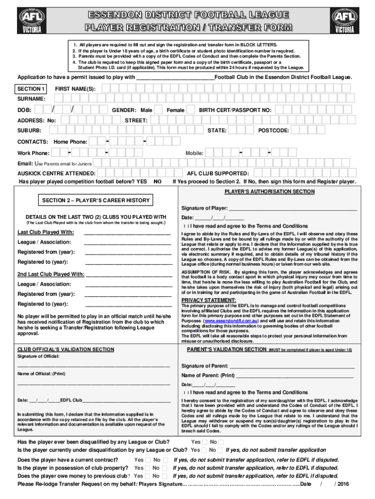 4. All players are required to fill out and sign the registration and transfer form in BLOCK LETTERS.