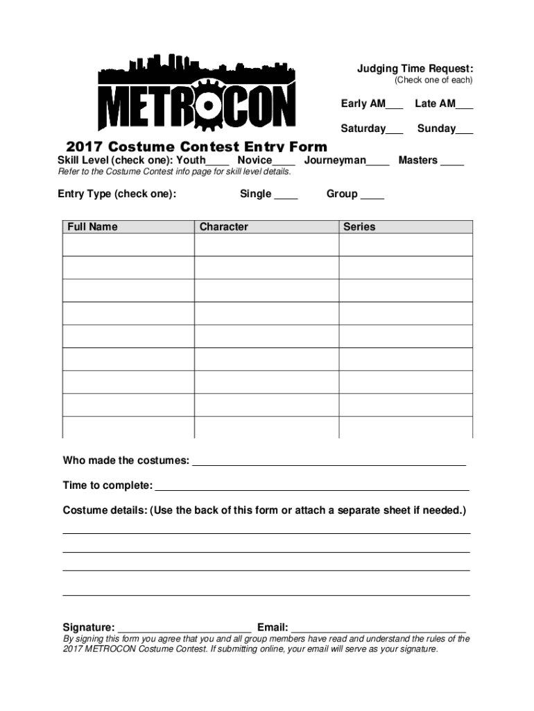 Judging Time Request: (Check one of each)Early AM Late AM Saturday Sunday 2017 Costume Contest Entry Form Skill Level Please print (check clearly prone): type. Youth Novice Journeyman Masters Refer