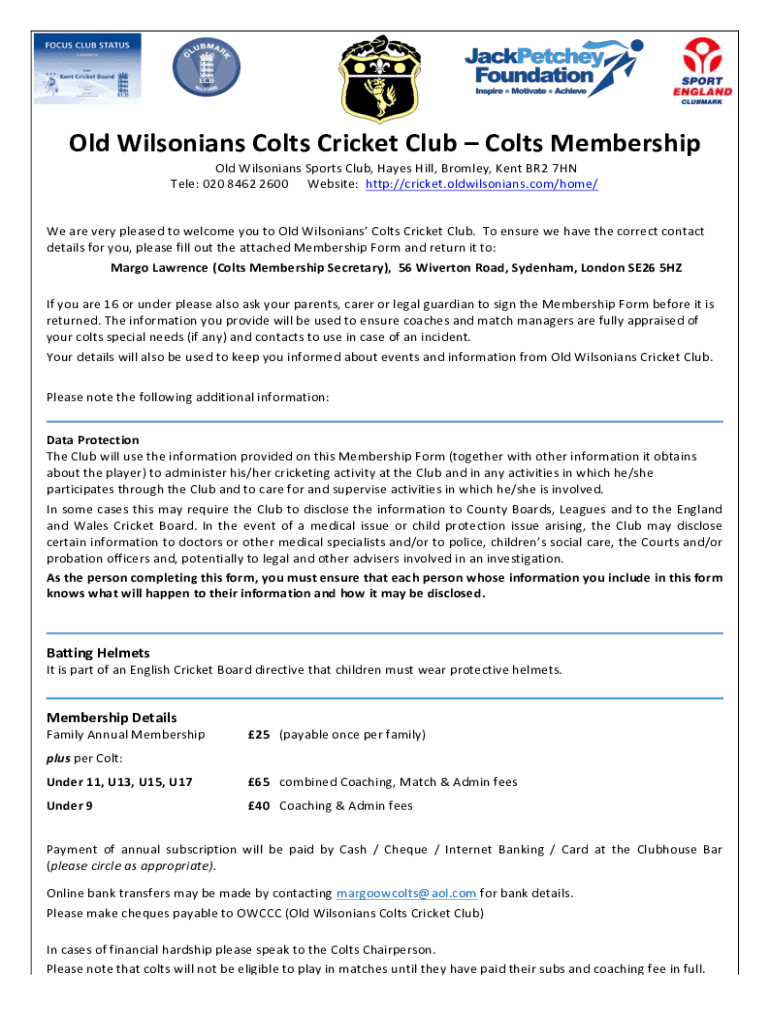 Anyone who wishes to become a member of OWCC Colts needs to fill out the membership form. This form is typically required for players who want to join the colts (junior) section of Old Wellingtonian Cricket Club. The membership form helps the club collect necessary information about the player such as personal details, cricketing experience, and preferences, which helps them manage team selection and communicate with members effectively.