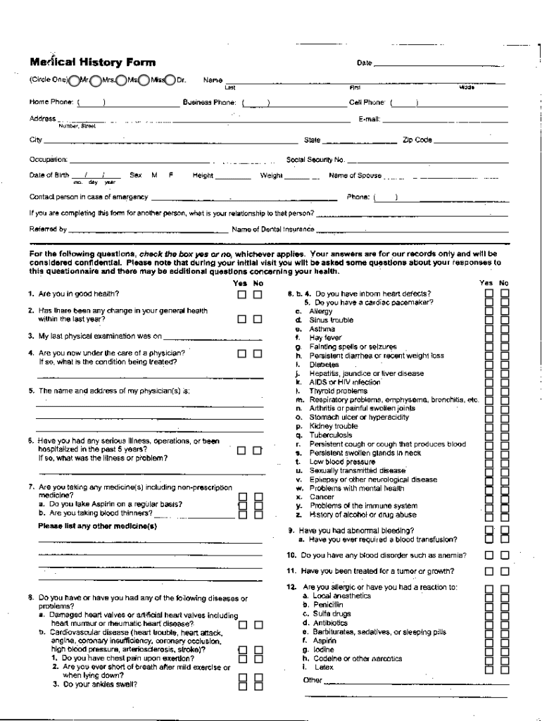);:Date Medical History Form (Circle One)Mr. Home Phone: (Mrs. Ms. Miss Dr.) Name t agribusiness Phone:, Cell Phone:, Middle, Email:Address Number. Streetcar:Occupation:Date of Birth1mo. Sex1dayMFHeight