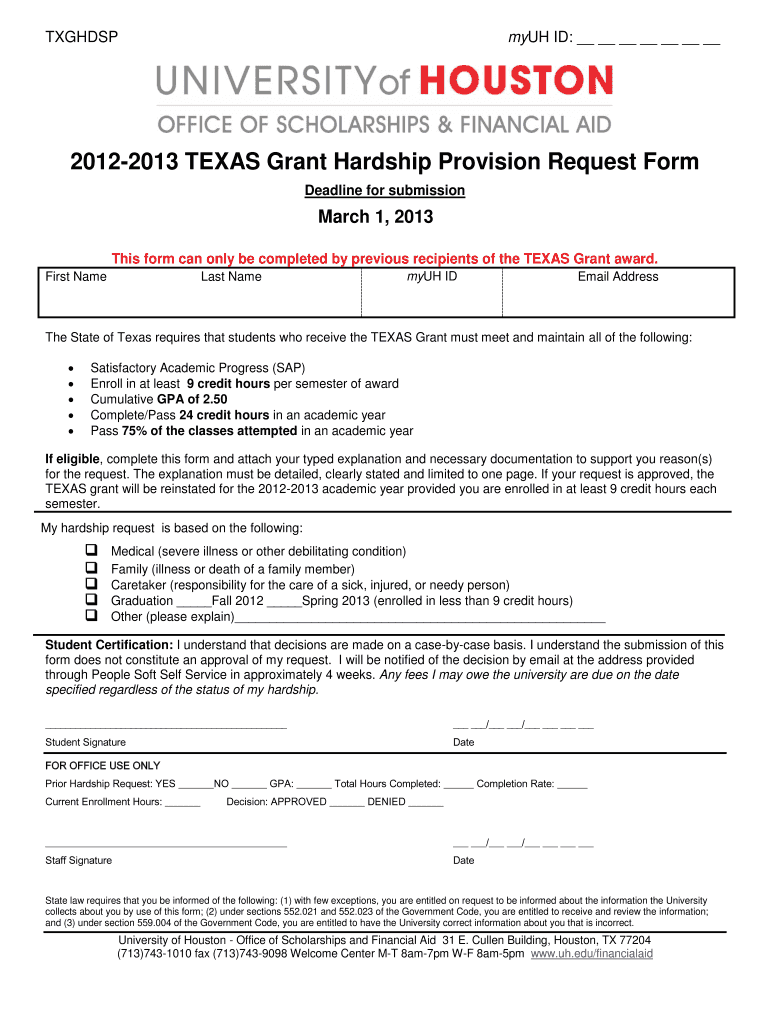 The completed Texas Grant Hardship Provision Request Form must be submitted by March 1, 2013, for the 2012-2013 academic year. Ensure to check for any updates if applying for future terms.