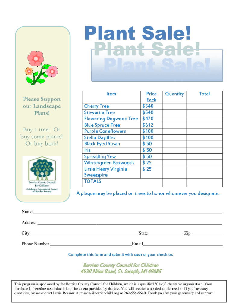 Plant Sale! Plant Sale! Plant Sale! Please Support our Landscape Plans! Buy a tree! Or buy some plants! Or buy both! Item Price Each Cherry Tree $540 Stewart Tree $540 Flowering Dogwood Tree $470