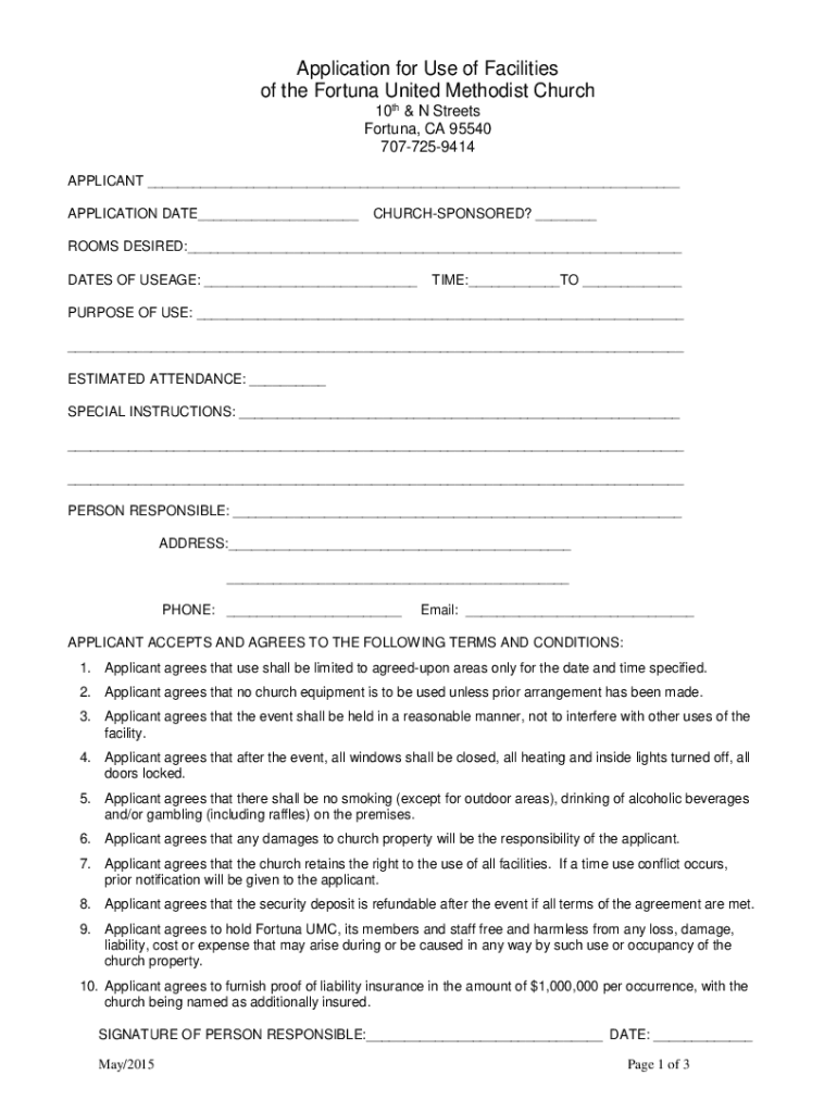 Application for Use of Facilities of the Fortuna United Methodist Church 10th & N Streets Fortuna, CA 95540 7077259414 APPLICANT APPLICATION DATE CHURCHSPONSORED? ROOMS DESIRED: DATES OF USAGE: TIME: