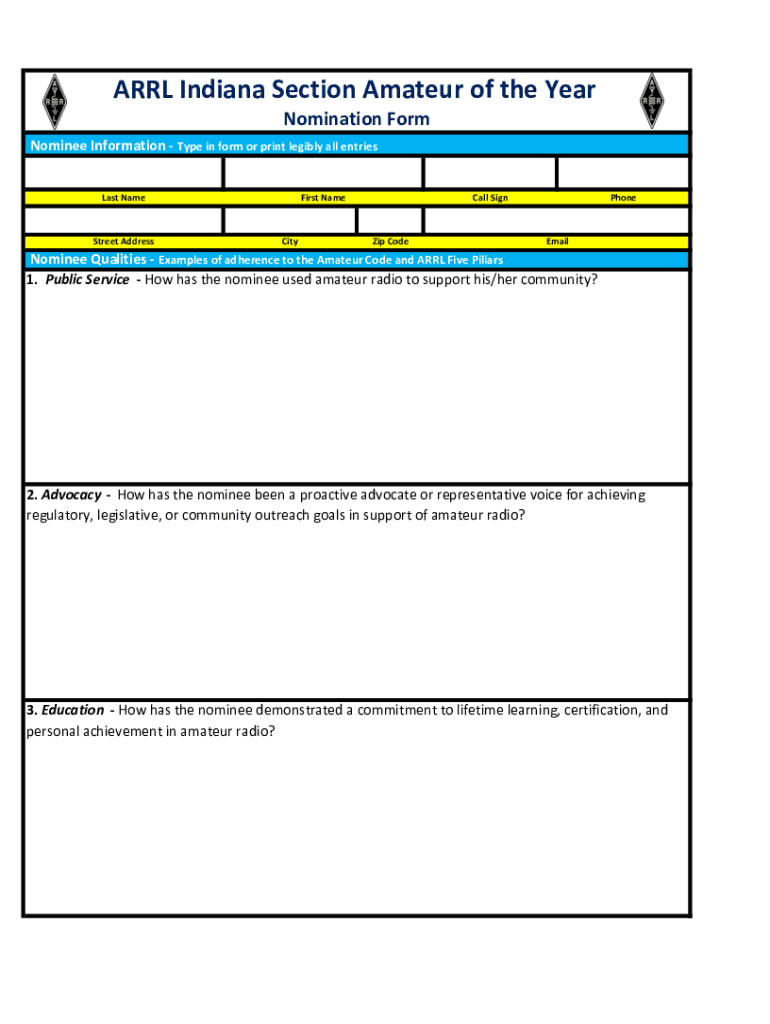 ARL Indiana Section Amateur of the Renomination FormNominee Information Type in form or print legibly all entries Last Backstreet AddressFirst NameCityCall WinZip CodePhoneEmailNominee Qualities Examples
